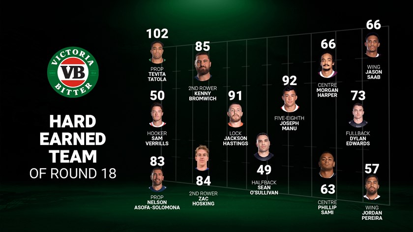Latrell Mitchell might have taken over the second half with the ball in hand, but it was the work of South Sydney teammate Tevita Tatola that stood out in the numbers from Round 18, with the Tongan international topping the VB Hard Earned Index for the week.