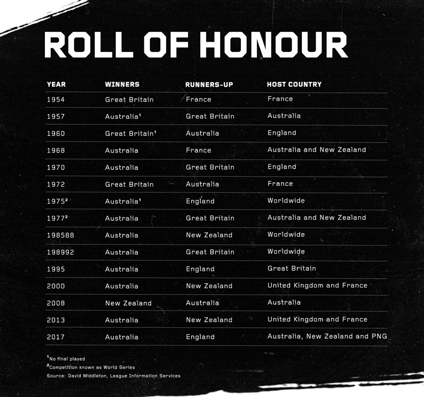 In the ensuing six decades the tournament has been dominated by Australia with 10 titles, while Great Britain’s only other success came in France in 1972 and the Kiwis finally savoured the ultimate glory at their 13th attempt, beating the Kangaroos 34-20 at Suncorp Stadium in a result that shook the league world.