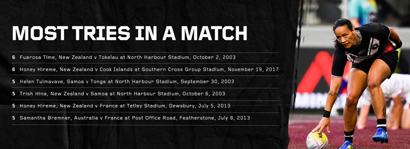 Hireme holds the record for most tries scored in a World Cup match with six against Cook Islands in 2017, an honour she shares with fellow Kiwi Fuarosa Time, who crossed six times Tokelau at North Harbour Stadium in 2003.