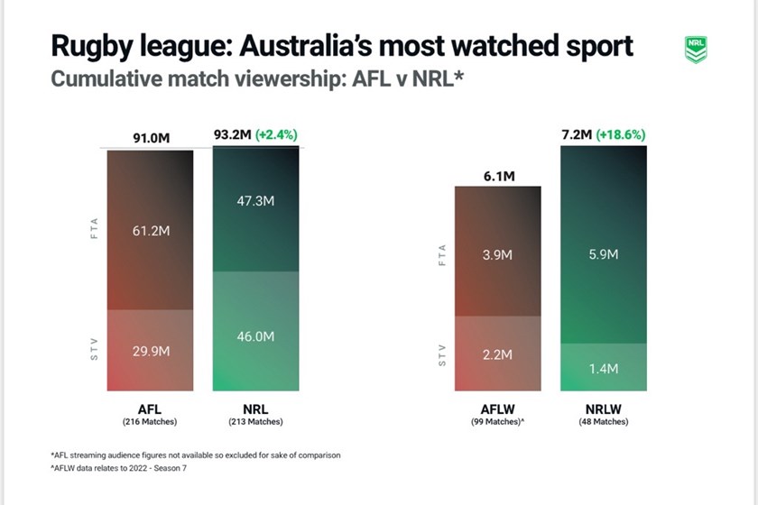 - NRL broadcast figures outstripping AFL, with 93.2m viewers tuning into Telstra Premiership matches on Nine and Fox Sports compared to 91m for AFL’s free-to-air and pay-tv coverage. Overall, rugby league viewership was 171.8m, making the code Australia’s most watched sport;