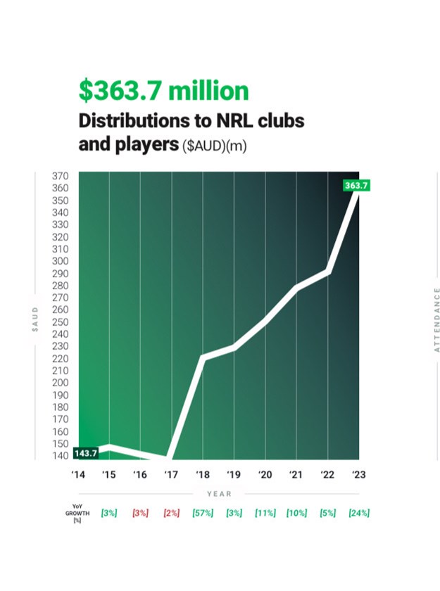 To underline the significance of the growth, with revenue increasing by $107 million from 2022, NRL earnings were just $350.9m in 2014 – less than the $363.7m distributed to clubs and players in 2023.