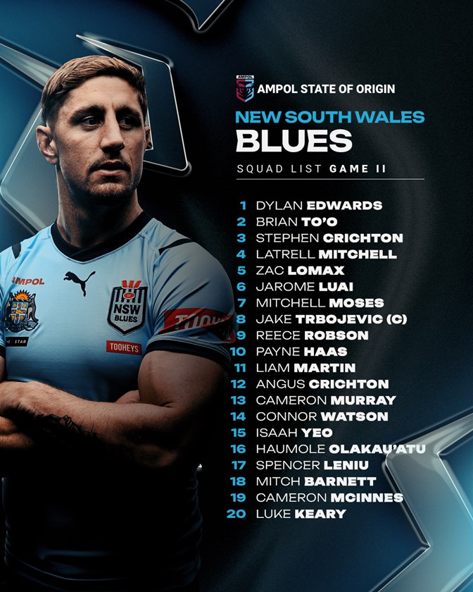 New South Wales Blues coach Michael Maguire has named his 20-player squad for Game Two of the Ampol State of Origin series to be played in Melbourne on June 26.