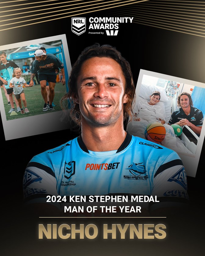 Cronulla-Sutherland Sharks half Nicho Hynes and St. George Illawarra winger Kimberley Hunt have been named the 2024 Ken Stephen and Veronica White Medallists at tonight’s Dally M Awards in Sydney.