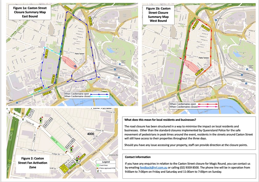 - If you have any enquiries in relation to the Caxton Street closure for Magic Round, you can contact us by emailing feedback@nrl.com.au or calling (02) 9359 8500. The phone will be in operation from 9am to 7pm on Friday and Saturday and 11am to 7pm on Sunday.