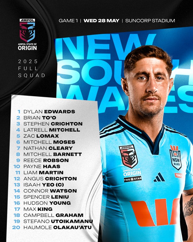 Latrell Mitchell and Stephen Crichton are the centres, as they were in last year's emphatic Origin II win at the MCG, while Cleary returns after missing the second and third match of the 2024 series through injury.