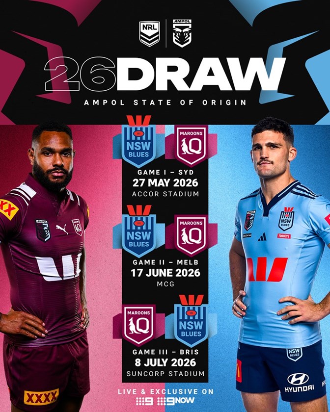 The 2026 State of Origin series begins at Accor Stadium on May 27, followed by Origin II at the MCG on June 17 and Origin III at Suncorp Stadium on July 8.